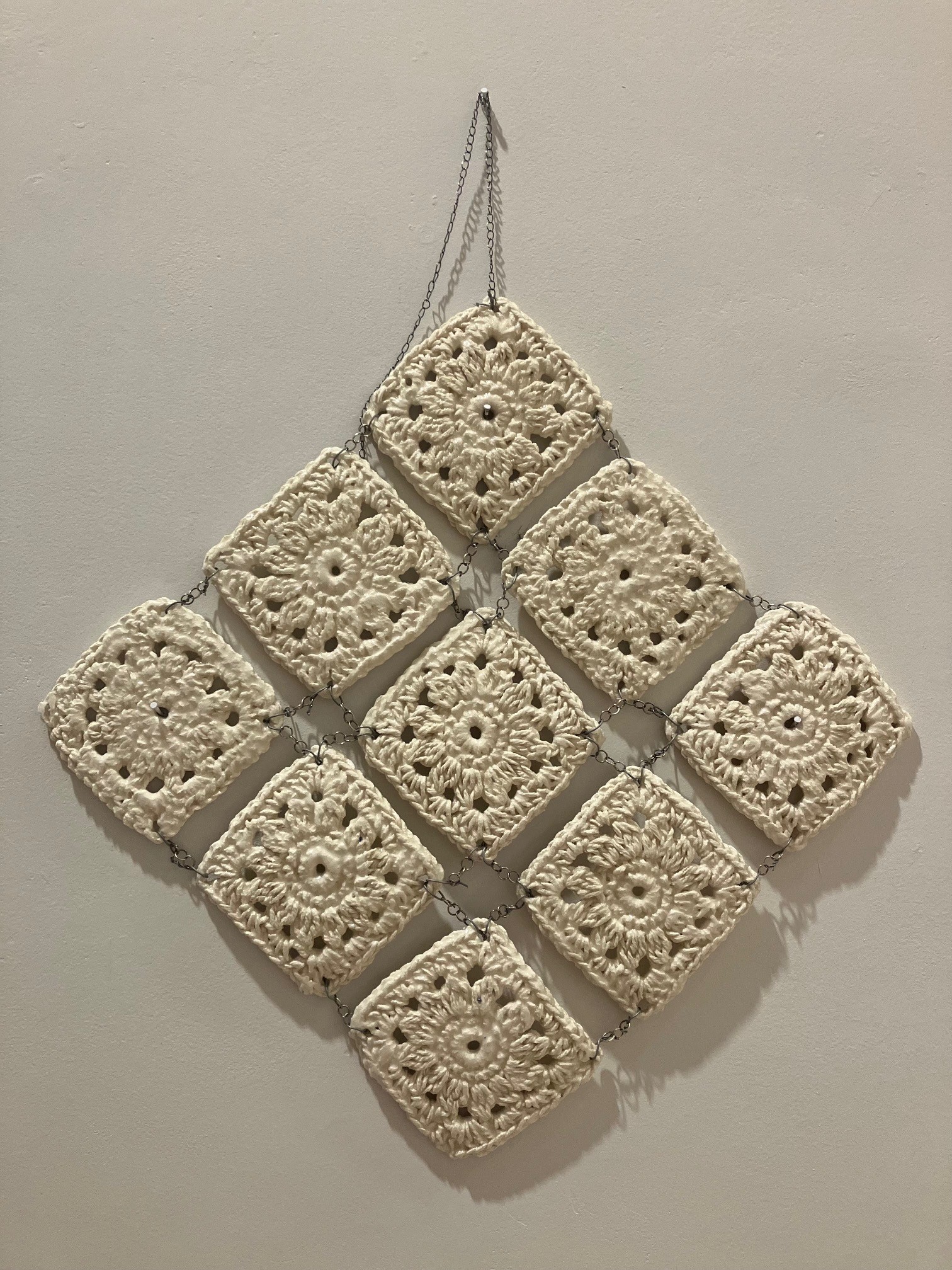 Olivia Hawk, “Beyond Function”, 2023; slip cast soaked granny squares, glaze, jump rings; Courtesy of the artist